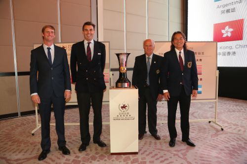 中国香港队代表费翔先生,英格兰队代表罗伯特·德瑞先生, 阿根廷马球总会副总裁阿尔贝托·高蒂先生, 美国队代表汝旭安先生与超级国家杯奖杯合影留念