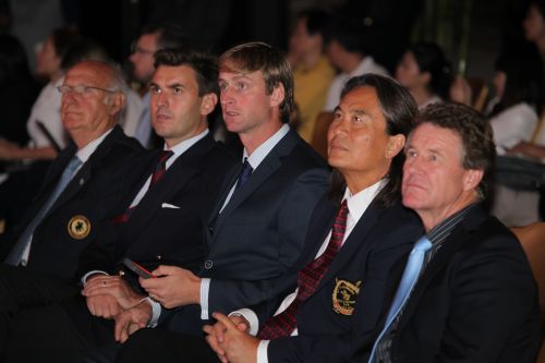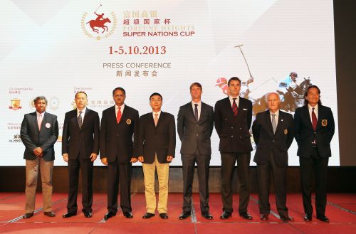 “2013富国高银超级国家杯”新闻发布会出席领导及嘉宾(从左至右):赛事总监彼德·阿比库葛拿登先生 、国家体育总局自行车击剑运动管理中心马术部国家队领队孙立生先生、国际马球联合会行政委员暨D区总监阿萨得‧朱马玻先生、国家体育总局自行车击剑运动管理中心马术部主任  中国马术协会秘书长李年喜先生、中国香港队代表费翔先生、英格兰队代表罗伯特·德瑞先生、阿根廷马球总会副总裁阿尔贝托·高蒂先生、美国队代表汝旭安先生