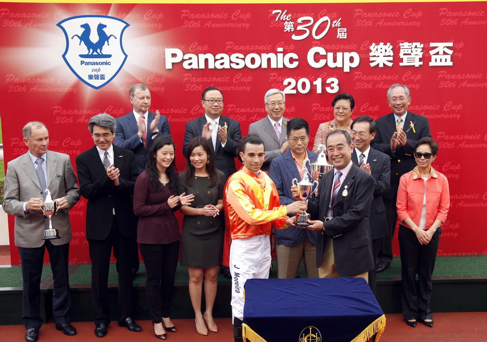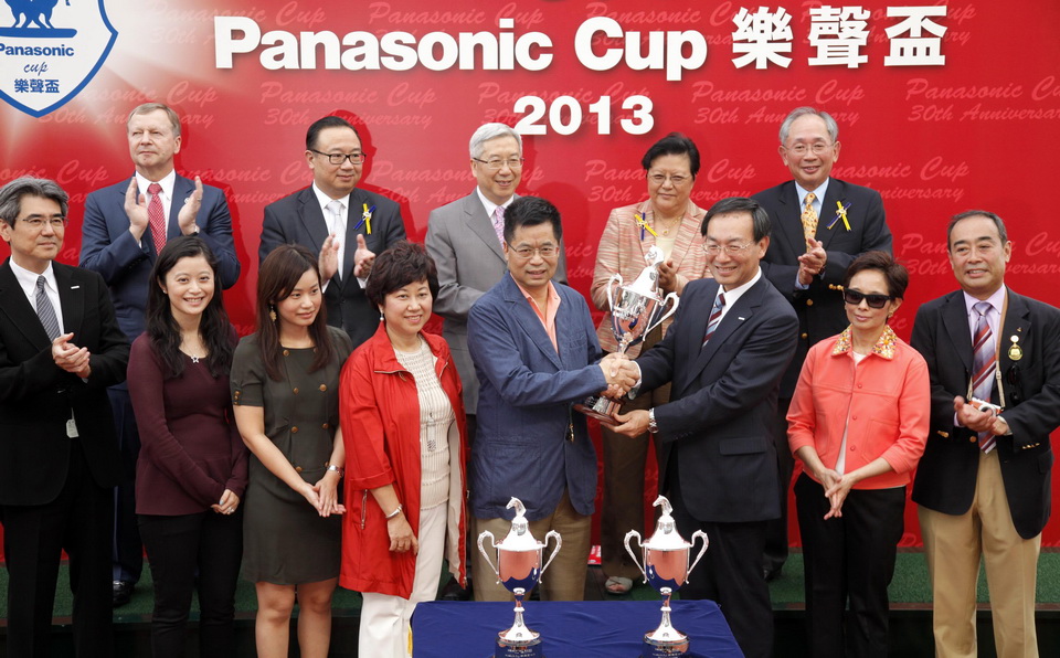 Panasonic Corporation社长津贺一宏先生于颁奖礼上颁发乐声杯予“旗帜鲜明”的马主郭灿耀先生。