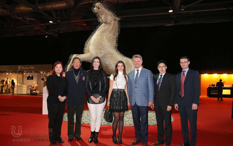 LONGINES 香港区副总裁欧阳楚英;香港马术总会主席及会长叶锡安博士;香港 Opera Gallery 负责人 ShirleyYablonsky 女士;Fernanda Ameeuw 女士;EEM World 总裁ChristopheAmeeuw 先生;香港“M”品牌体育活动奖首席评判及大型体育活动事务委员会委员霍启刚先生及 EEM Asia 副总裁 Matthieu Gheyen 先生一同与苏格兰艺术家 David Mach 的作品“种马”合照。