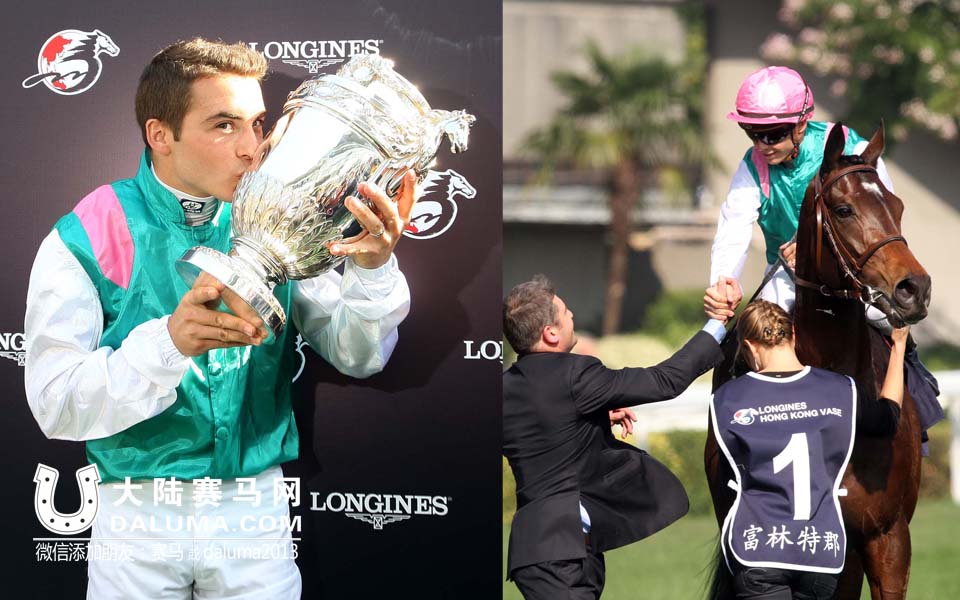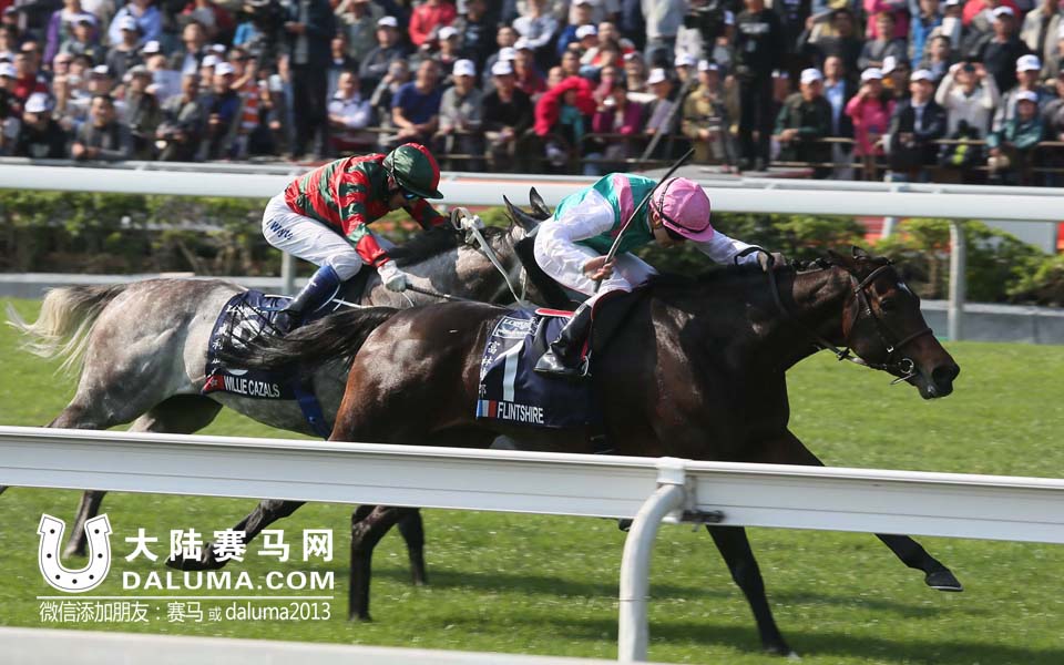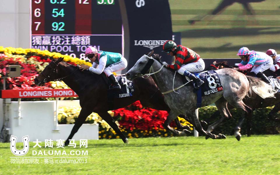 法国代表“富林特郡”(1号)在骑师纪仁安胯下压倒香港代表“威利加数”(8号),捧走浪琴表香港瓶(国际一级赛2400米)。
