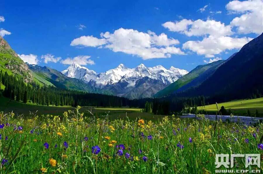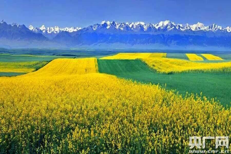 七月的昭苏高原,百万亩油菜花盛开,席卷着一望无垠的绿色草原,金色的花海与远处雪山、蓝天、白云构成壮美景色。