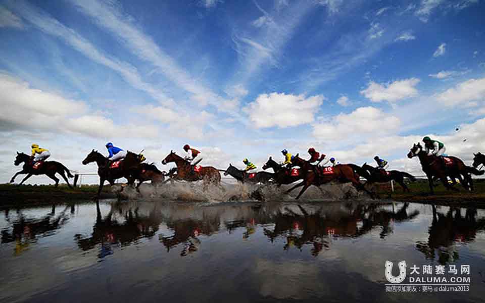在纽伯里赛马场障碍赛的马匹一一顺利跳过了水坑。