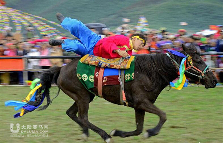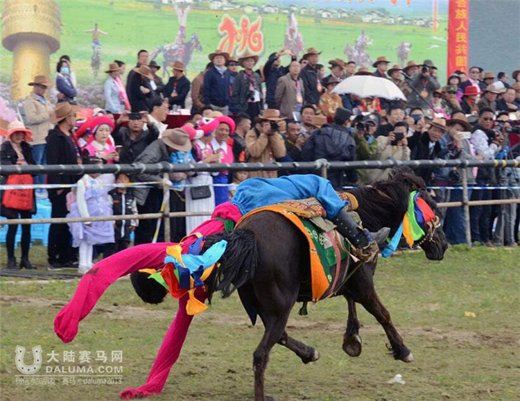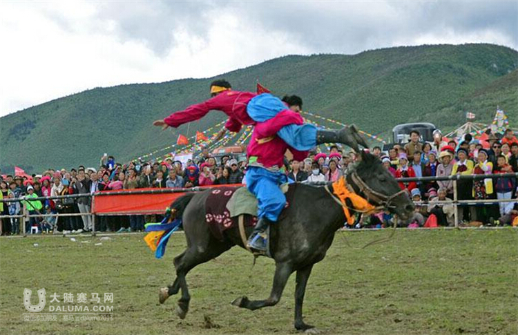 随着裁判的指令抢一响,训练有素的马术选手们疯狂地在风驰电掣的马背上表演站立、倒立、跨立、多人叠立等动作,无比惊险刺激,稍有差池将人仰马翻伤亡难料。现场的空气都是紧张的,激昂的赛马乐、尖叫声、欢呼声疯狂地覆盖了香格里拉仙人洞赛马场的每一寸土地。
