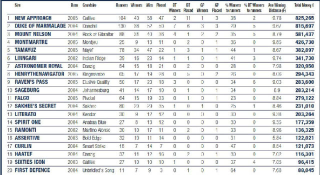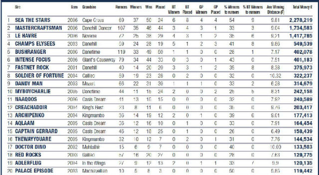 以下表格分别列出了欧洲种马2岁和3岁子嗣奖金收入排名。爱尔兰华人之骄傲:海都之星(配种费8.5万欧元)当然不让成为了欧洲2岁子嗣最佳的种马,奖金收入总合高达228万英镑。所有子嗣出赛获胜率也位居榜首54%。