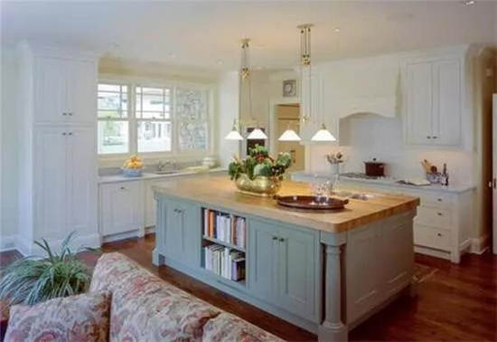 别墅的其他地方看上去还是比较时髦的,但是厨房的装饰还是很平易近人的。你看,厨房中间像小岛一样的地方很可以放很多菜谱。