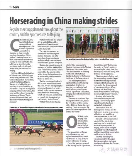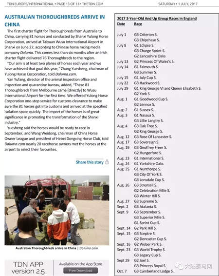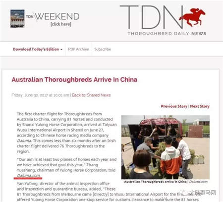 时隔两日,美国第一、全球领先的《纯血马每日新闻》(Thoroughbred Daily News,简称TDN)用半个版面转载大陆赛马网报道,以《Australian Thoroughbreds Arrive In China》为题向全世界第一时间发布了中国赛马的发展动态。