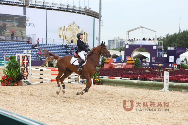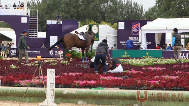 不知是不是由于今天举办地北京突然降温,也有3级风力的原因,第二位出场的月河湾马术俱乐部娇娇和第三位出场的西坞马术俱乐部彭伊林都在相同的障碍处坠马,第八位出场的国发马术俱乐部的李哲跟爱马虎跃都双双坠地,李哲摔倒在场地中央的花坛边,马匹则重重摔到花坛里,现场的人都在为骑手和马匹揪心,好在马匹很快自己站了起来,踉踉跄跄的走出了花坛。第十七位出场的天星调良的邹涛的爱马solo、第十九位出场的月河湾马术俱乐部的林飞的爱马珍奇、第二十一位出场的亚萨园马术俱乐部的周李强的爱马CARLA BRUNI,都是因为马匹两次不服从骑手被淘汰。