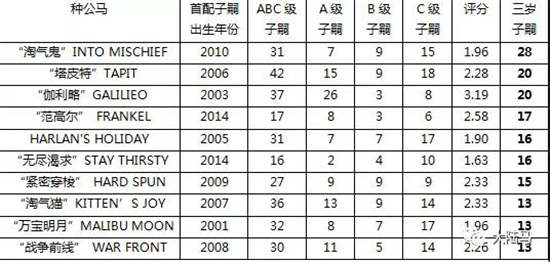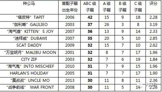 2017北美及欧洲地区种公马ABC级三岁子嗣数量排行前十: