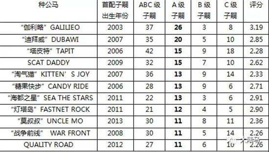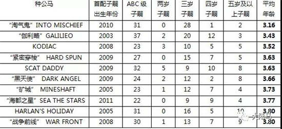 2017北美及欧洲地区种公马ABC级子嗣平均年龄排行前十: