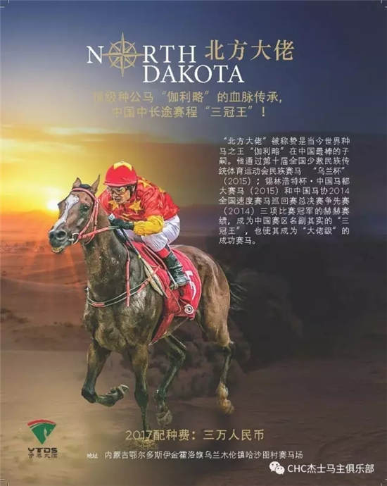 “北方大佬”(North Dakota)出生于2010年5月14日,是一匹枣色公马。在很多人的心目中,“北方大佬”可谓是“伽利略”在中国最好的后代子嗣。他在中国的赛场上屡屡夺冠,成为了中国“三冠王”。他获胜的比赛包括:2015年第十届全国少数民族传统体育运动会民族赛马“乌兰杯”(3000米)、2015年锡林浩特杯·中国马都赛(2000米)、中国马协2014全国速度赛马巡回赛总决赛争先赛。