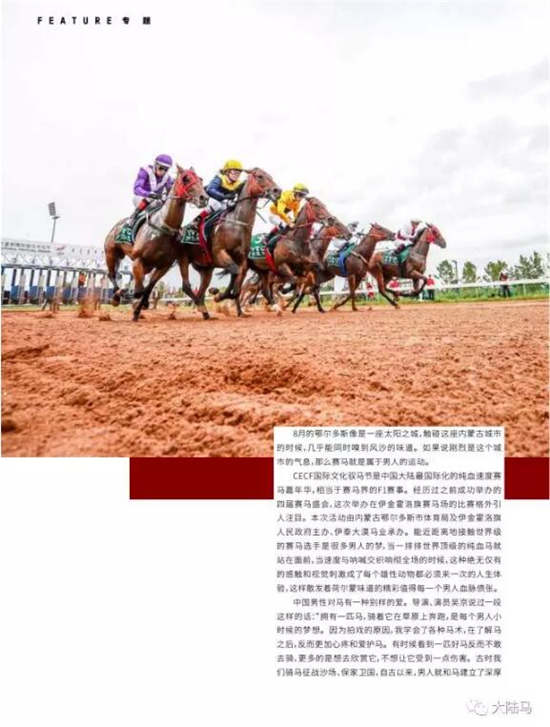 CECF 中国大陆最国际化的纯血速度赛马嘉年华,相当于赛马界的 F1 赛事。经历过之前成功举办的四届赛马盛会,这次举办在伊金霍洛旗赛马场的比赛格外引人注目。