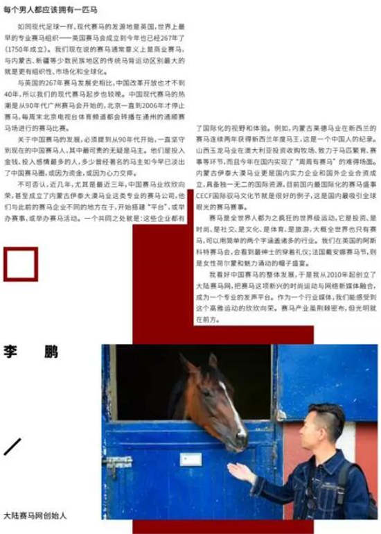 我看好中国赛马的整体发展。于是我从 2010 年起创立了大陆赛马网,把赛马这项新兴的时尚运动与网络新媒体融合,成为一个专业的发声平台。作为一个行业媒体平台,我们能感受到这个高雅运动的欣欣向荣。赛马产业虽荆棘密布,但光明就在前方。