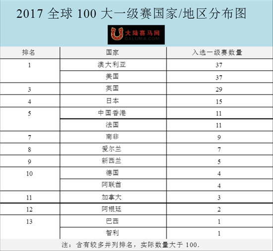 从位列全球100大的全球一级赛数量来看,分别位于南北半球的澳大利亚和美国是名副其实的赛马大国;而在亚洲,日本和中国香港在全球赛马版图上占据十分重要的地位;南非以九项赛事入围独自扛起非洲大陆的赛马大旗;欧洲的英国和法国整体呈现下滑趋势,受到的挑战不小;南美洲的阿根廷、巴西、智利向世界宣告:我们不仅足球踢得好,马也跑得好!