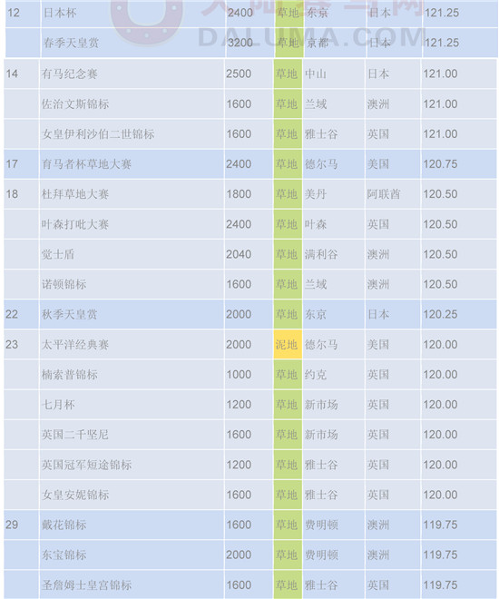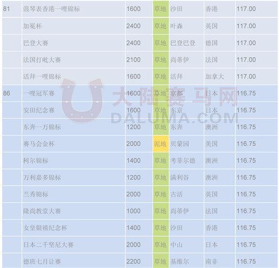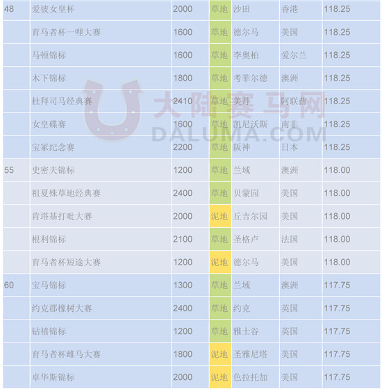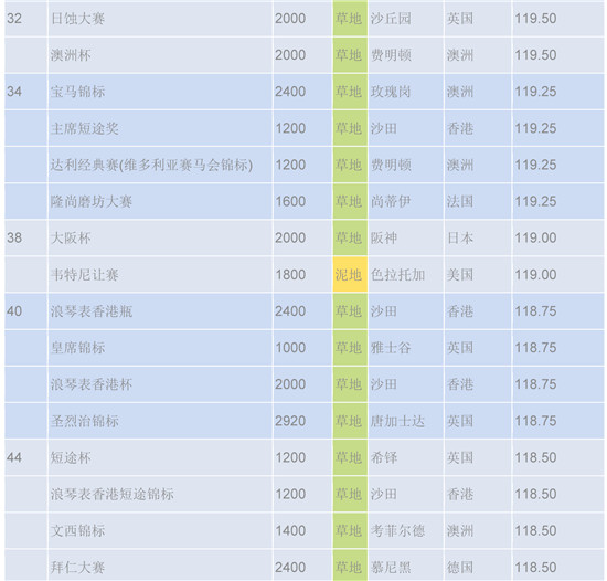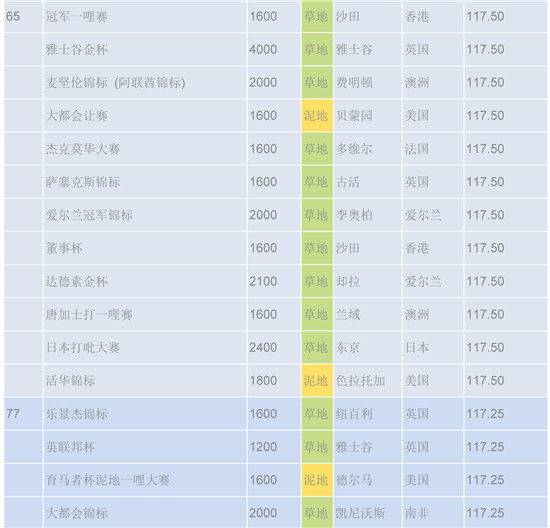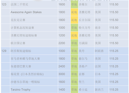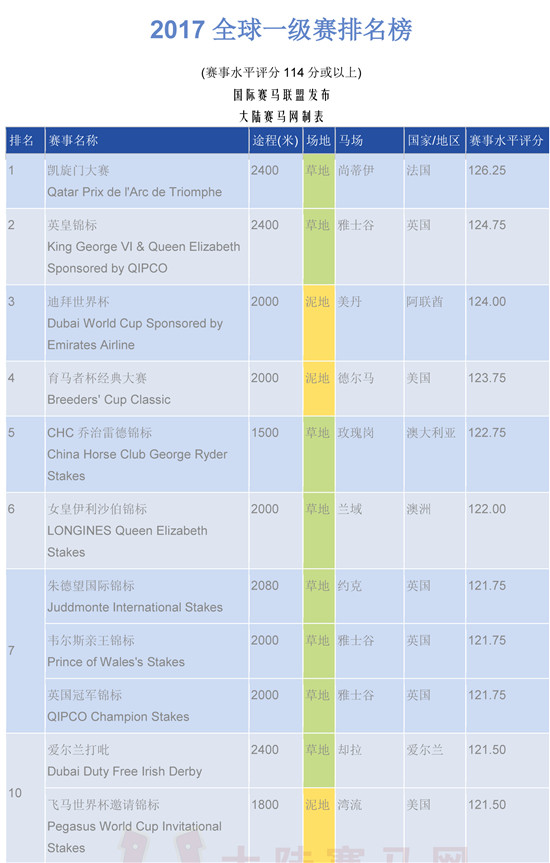 欧洲奖金最高(500万欧元)的“凯旋门大赛”时隔一年,以126.25分的高评分再次成为世界第一赛事。2015年凯旋门大赛问鼎全球第一时的评分是125.75分,去年凯旋门大赛下滑至第七位时评分为122分。2016年世界排名第一的赛事——美国育马者杯经典赛今年以123.75分的评分下滑至第四位。