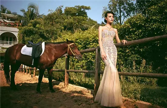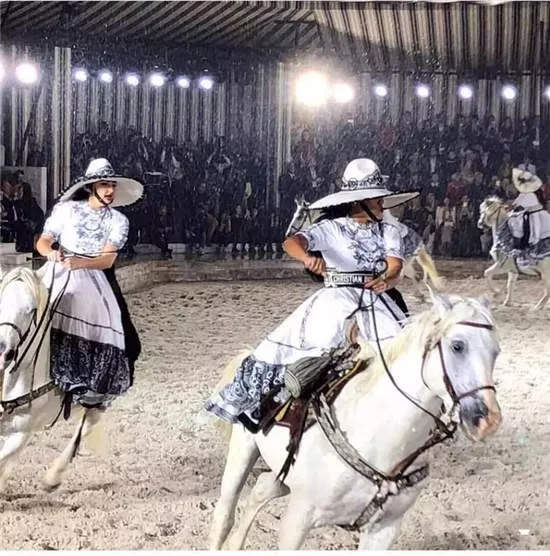 这些身材健美的女骑手们身着能凸显其女性魅力的服装,宽大的蓬裙、精美的刺绣、绚丽的色彩、硕大的女帽和花卉刺绣等墨西哥传统服饰的八位女骑士驾着白马开启服装秀,展现了刚强健壮同时优雅奔放的女性美。