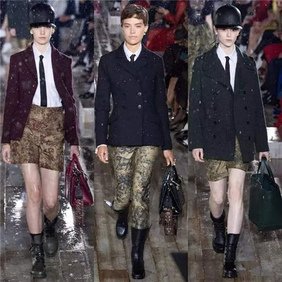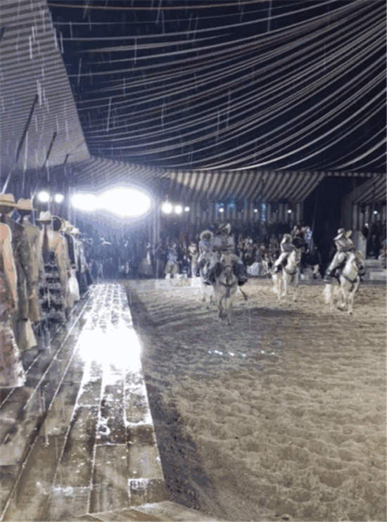 优雅又华丽的秀整场都在大雨中进行,这场雨像有意为之,为早春度假系列增添了色彩和难忘。作为本次时装秀的举办地,尚蒂依不仅拥有悠久的花边制作历史,还是一座马术传统名城,这种双重背景令本场大秀更显意义非凡。