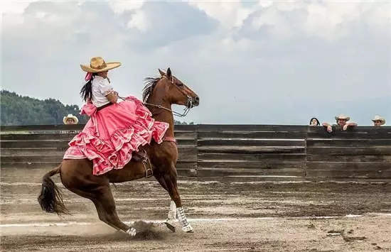 Escaramuza意为墨西哥传统马术女骑手,她们有权和男人一同参加名为charreada的牛仔马术竞技,并在公众的注视下完成表演过程中的多项马术比赛。
