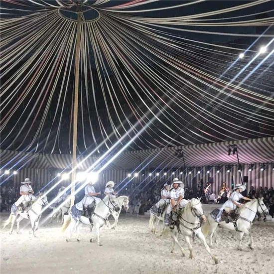 入场后,看秀嘉宾们围坐在马场四周。伴随着现场音乐声起,八名墨西哥女骑手策马入场,现场开始了马术表演。