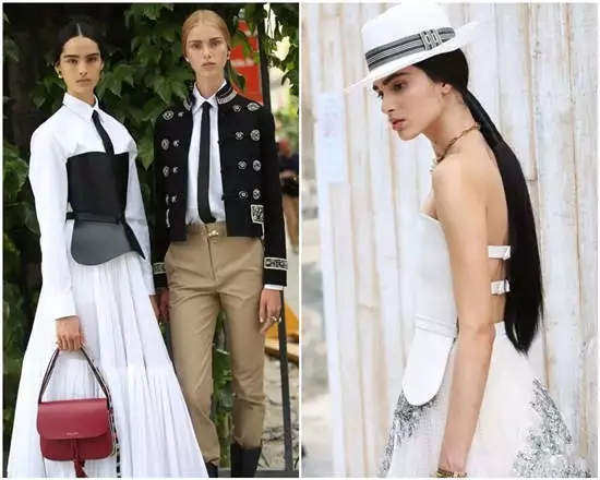 秉承这一设计理念,日本纯棉外套与多种廓形的长裤或短裤式半裙相组合,其中多款半身裙的褶纹装饰令人不禁联想到Dior迪奥先生为1948年春夏季高级订制系列设计的Drags连衣裙。经由Maria Grazia Chiuri全新构思的标志性Saddle手袋、一件白色或条纹男式衬衫和一条黑色细领带则为整体造型画上点睛之笔。