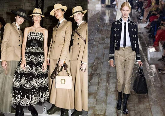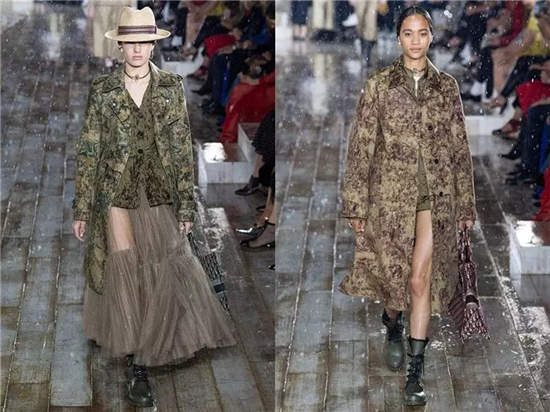 本季设计中使用了多种不同的面料,包括经典的法式约伊面料、浪漫唯美的蕾丝面料,配以老虎、蛇等一系列野生动物图案,来彰显Dior女性刚柔并济的一面。