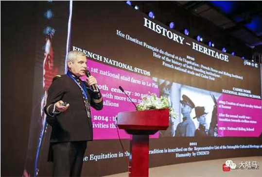 法国国家马业马术学院国际项目经理Laurence Cornaille女士和黑骑士古典马术表演首席骑手Patrick Teisserenc上校首先为大家播放了一段精彩的黑骑士盛装舞步的表演视频。他梳理了法国黑骑士学校的发展历史并系统的介绍了黑骑士学校作为法国传统的非物质文化遗产的传承人的角色一直以来对法国传统马术的传承、发展和推广。