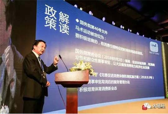 前中国马协秘书长常伟先生首先对国务院第46号文件进行了详细的政策解读,并介绍了未来五年与中国马术有关的重大体育赛事。随后,常伟分析了目前中国马术发展的短板,他将其通俗的概括为三个关键词,即:挺麻烦、挺乏味、挺费钱。针对短板,常伟结合其数十年的从业经历提出了几点切实的建议,一、加强马术赛事场馆的粘性,二、延长观众在比赛场馆内的停留时间,增加与观赛相关联的消费,三、丰富其他消费项目,即餐饮、娱乐等项目。最后,常伟谈到本届峰会的主办地杭州即将在2022年举办亚运会,他分析了亚运会的马术项目即将面临的挑战,并对这些挑战提出了一些针对性的建议。