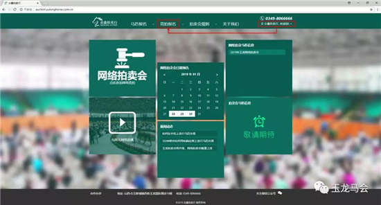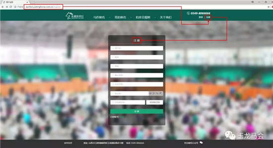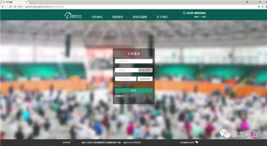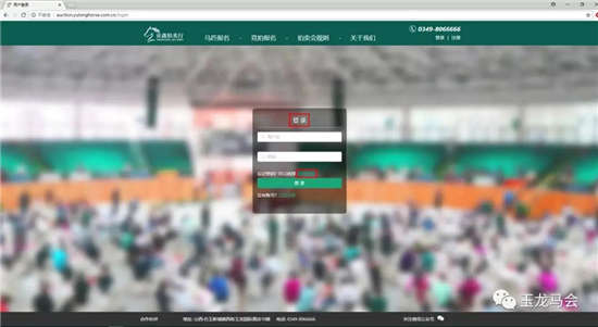 也可以在电脑浏览器中输入网址http://auction.yulonghorse.com.cn/ (复制该链接至浏览器即可)进入2019玉龙网络拍卖会。点击右上角“注册”按钮完成注册,成为用户,已在手机客户端完成注册的用户可直接点击“登陆”(如下图所示)。