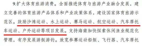 去年年底,国家发展和改革委员会发布关于印发《海南省建设国际旅游消费中心的实施方案》的通知,鼓励沙滩运动、水上运动、赛马运动、航空运动、汽车摩托车运动、户外运动等项目发展。