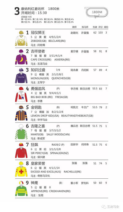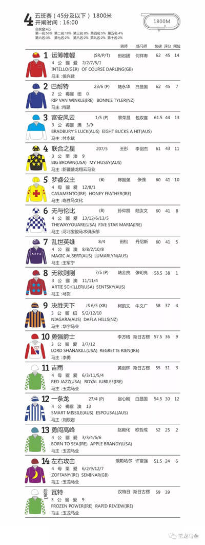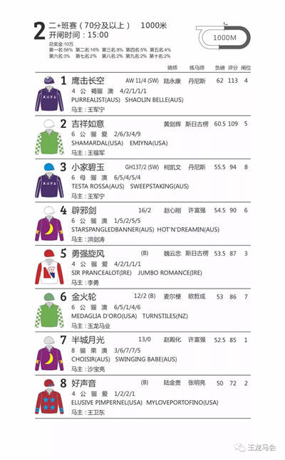 除了憾居第二的“辟邪剑”,本场还有2018赛季首匹千米途程跑入1分钟(59.59秒)的“鹰击长空”、2017赛季的马王“吉祥如意”、玉龙赛场目前千米最快速度(59.01秒)的纪录保持者“好声音”等名驹列阵。