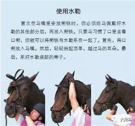 将衔铁放置在复合水勒或传统水勒的一侧,然后用拇指按压马上唇部的下方,使马放心地张开嘴,然后平稳地将衔铁放进马嘴中并系好。如果你在这个过程中遇到了困难,那就要检查一下马的牙齿。