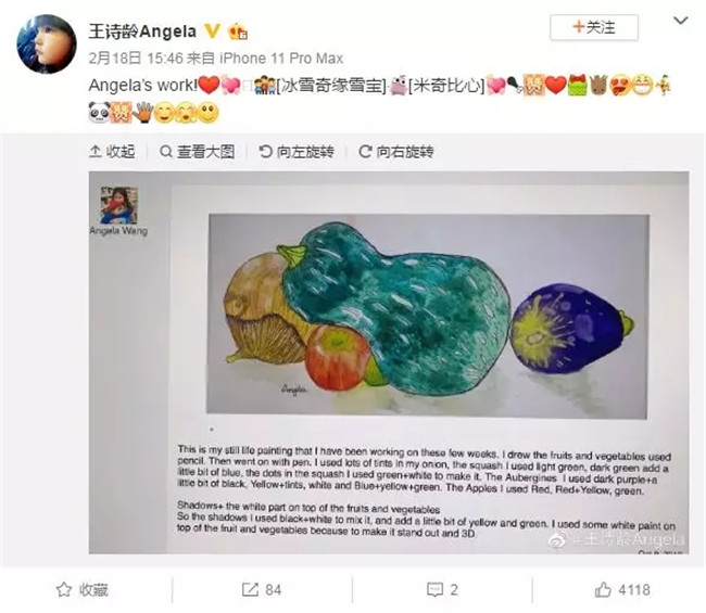 2月时候,王诗龄晒了一张自己的画,不仅画了家中的蔬菜,还用英文流畅地表达出自己的创作想法。