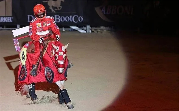 身穿法拉利队服、带着车手头盔的女孩叫吉娜·舒马赫,车马迈克尔·舒马赫女儿,她在马术比赛中做F1主题表演,向他的父亲、F1七冠王致敬。吉娜也让她的爱马穿上了法拉利赛车一样的红装,而且还表演了F1式的“进站”,甚至还给爱马装上了“尾翼”。这样的场景,看得我眼泪止不住地流。