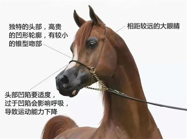 以“美貌”著称的世界上最古老的马种之一的阿拉伯马,有一个美丽、精致的头,前额短而宽、成楔型。脸的侧面是凹的。眼睛特别地大而且突起,深遂且流露感情。全身光滑无杂毛,脖子长,尾巴高高耸起。
