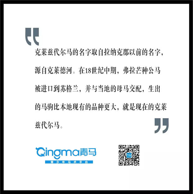 克莱兹代尔马是挽马的一个品种,它的名字来源于苏格兰克莱兹代尔县的农马。尽管它最初只是挽马中一个较矮小的品种,但它现在已经是一个高大的品种了。克莱兹代尔马往往是枣色,并有着明显的白色标记,该标记源于它们身体里存在的落羽杉基因。这种马最初是用于农耕和拖运,如今也仍然被用作挽马。百威克莱兹代尔马是一群最著名的克莱兹代尔马,其次是英国皇家近卫骑兵的鼓马。克莱兹代尔马也被用于创造和改善其它品种。