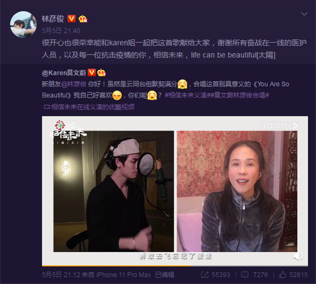 在高晓松总策划的“相信未来”义演第二场演出中,与莫文蔚组成超意外组合,献唱了《You Are So Beautiful》。演出结束后,莫文蔚还主动@林彦俊,分享两人的“云同台”感受。