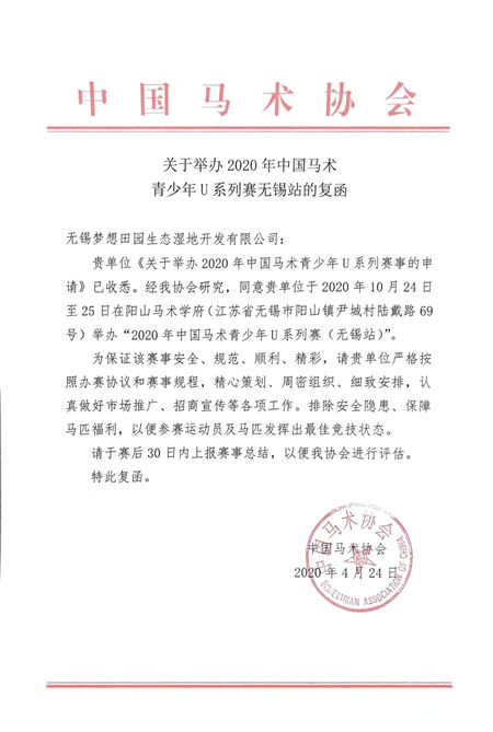 几乎与此同时,在江苏极具影响力的无锡头号马术俱乐部——梦想马术已经得到中国马术协会的正式复函,将在10月24日举办2020年中国马术青少年U系列赛(无锡站)的比赛。