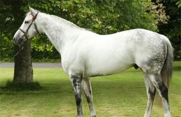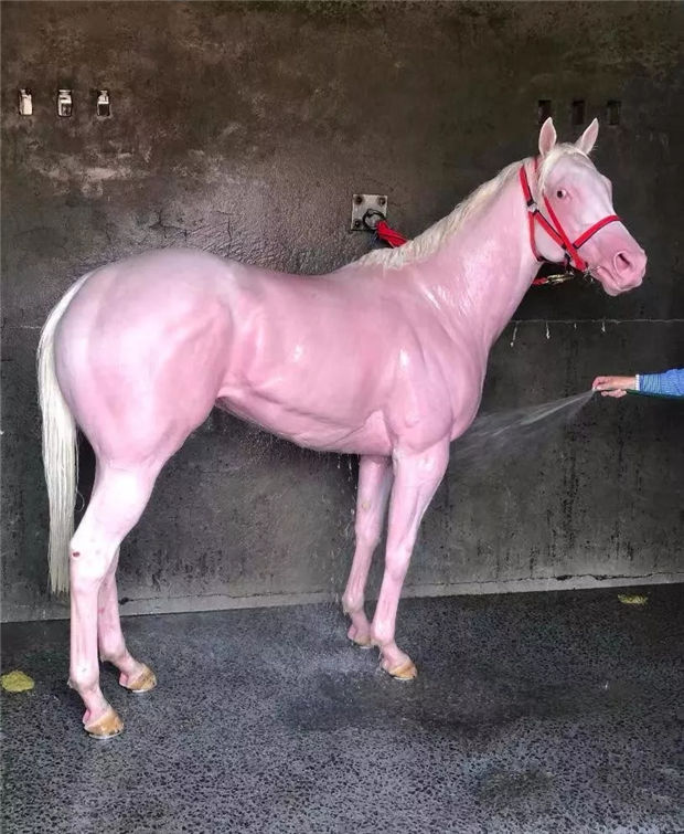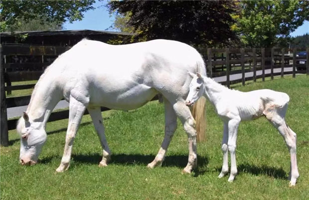 可以看到,白色毛色马匹马匹身上毛发,四肢,鬃毛和尾毛的毛发皆为白色,而皮肤是粉红色及浅色的眼睛。这种毛色的马匹比例极少。白色之所以出现,是因为马匹某对“神奇”的基因中的一条基因出现“状况”:若整对基因正常,则该马颜色就会由其他基因决定;但若整对基因皆有问题,该马则无法生存而会在成胎时被吸收。所以,我们在赛场上看到的白马非常的稀少,因为本身白色毛色的马匹就少,能够通过竞赛检验、拿到冠军的更是少之又少了。