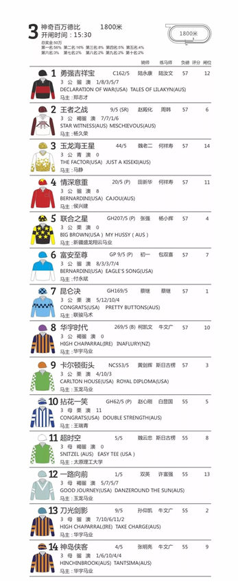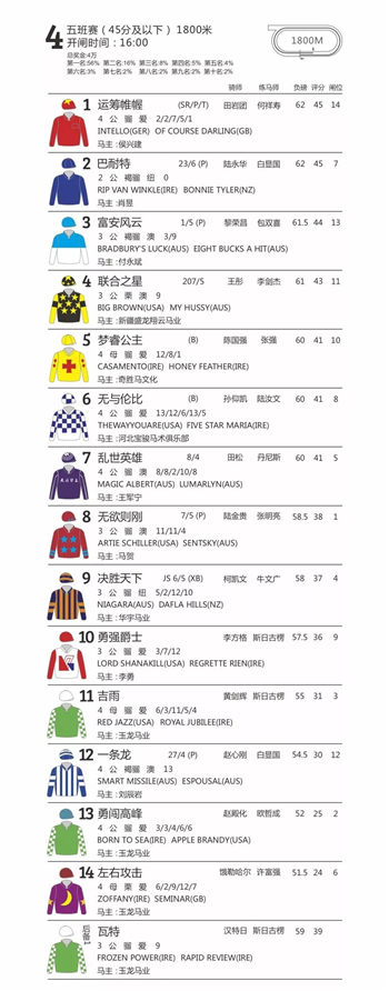 2019年5月18日,2019玉龙国际赛马公开第2比赛日——红磨坊主题赛马日举行。当天,共计5场大赛,64匹赛驹出赛,赛事总奖金额34万元人民币。第四场途程1800米、奖金4万元的五班赛(45分及以下)中,马主侯兴建旗下赛驹“运筹帷幄”(父系:“才智高”Intello)在骑师田岩团策骑下率先冲线夺得冠军。
