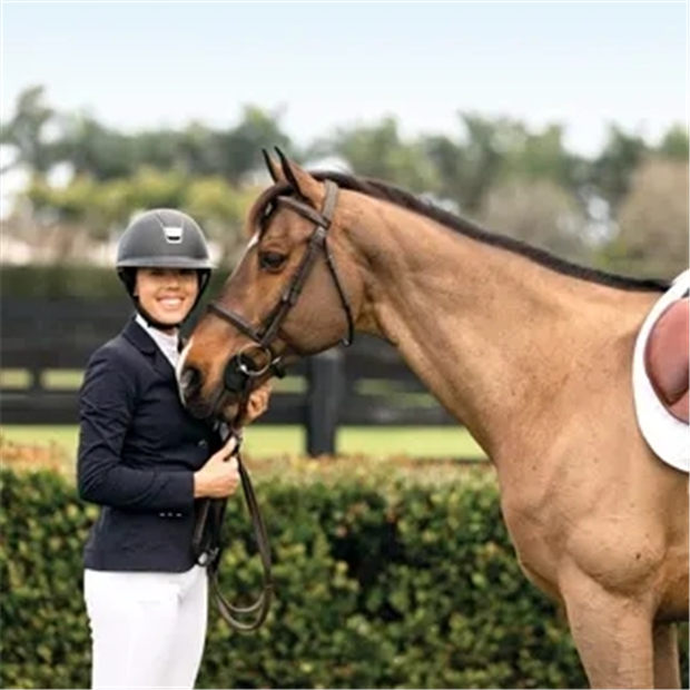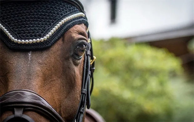 凯伦·保利带有镶嵌赞助商Mikimoto珍珠的马辔头饰,也是世界马术赛场一大特色了!