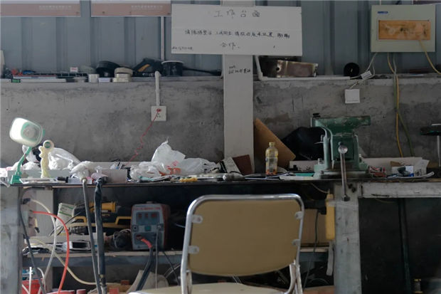冉建忠正在把机器做出来的型材搬上架子,准备拖到下一处进行再一步的加工