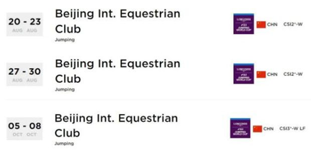 图:国际马联官网最新公布的马术世界杯中国联赛三站赛事举办时间和举办地
