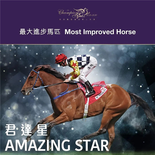 大陆赛马网讯 7月16日晚,受新冠疫情影响,原本要在香港瑰丽酒店举行本年度的冠军人马奖颁奖典礼及晚宴临时取消,改为网上直播举行。由丁冠豪训练的“君达星”(Amazing Star)获选为本年度最大进步马匹。“君达星”季初由58分起步,季内六战四胜,至季终评分大幅增加了42分至100分。 “君达星”的马主是君达之友赛马团体。