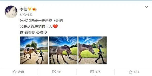 近日,演员靳东妻子李佳在微博罕见晒娃,原来为培养孩子全面发展,李佳在孩子学习之余,还专门带孩子去马场学习马术。