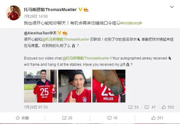 近日,德国著名的足球明星、世界杯冠军队主力托马斯·穆勒视频连线了中国马术明星骑手华天,并且向华天赠送了亲笔签名的拜仁慕尼黑球衣。或许是因为穆勒妻子是盛装舞步骑手的缘故,双方聊起马术不仅专业而且幽默,期间两人还挑战了绕口令“八百标兵奔北坡, 炮兵并排北边跑……”场面爆笑,非常有趣!