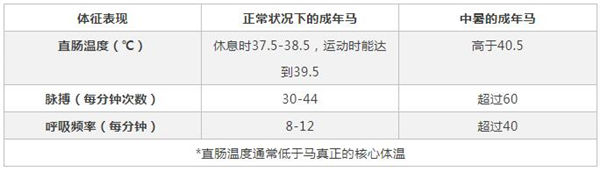 马的热应激表象有,直肠温度超过39℃,心跳和呼吸加快,大量出汗,耳朵下垂、显得十分疲态、有脱水症状(捏起马的颈部或肩部皮肤,褶皱几秒钟才能复原)。如果马在极度炎热或潮湿的情况下工作,很有可能发生中暑,中暑是严重的过热症状,中暑的表象有:直肠温度超过41℃,停止运动后20分钟心跳和呼吸依然急促降不下来,嘶鸣、无精打采、显著的脱水症状(捏起马的颈部或肩部皮肤,褶皱4-10秒钟才能复原),肌肉显著无力,行动不协调甚至倒下等。
