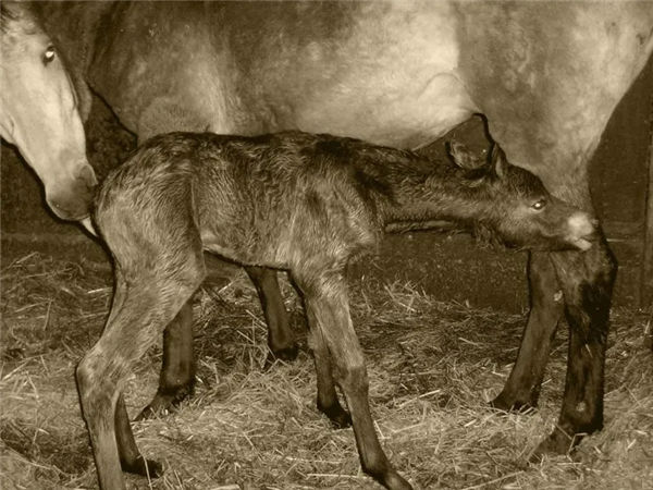 刚产下的马驹可在出生后十五分钟到半个小时内站立起来,母马会在一旁小心看护。站立起来之后,马驹会立刻寻找母马吸第一口奶。