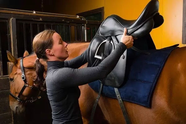 在装备汗屉和肚带之前,应先站到高处(如一个木凳或者桶上),将马鞍高高地放在马肩隆上。一手握住前鞍桥,另一只手握住后鞍桥,然后用握前鞍桥的手沿着脊椎到马尾的方向挤推马鞍。握后鞍桥的手只需用来控制住马鞍。如果马鞍“固定”在马背上,不能再往后挤推了,就可以算作到位了(人们经常会有倾向将马鞍放置得太靠前,即便是靠前一两公分也会影响马鞍导致不合适)。如果马鞍没有“固定”住,并且能一直向尾部方向移动,那就说明鞍架太宽。这个时候要检查马鞍的两侧。