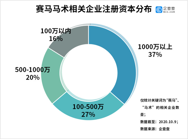 从注册资本来看,企查查数据显示,注册资本在1000万元以上的赛马马术相关企业数量最多,占比高达37%,注册资本在100万-500万元的占比约为27%,排在第二位。注册资本在500万-1000万元的排第三位,占比约为20%。