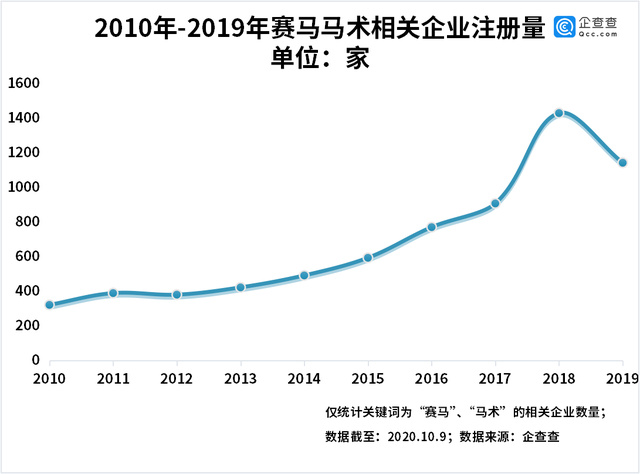 2010年以来的十年间,赛马马术相关企业年注册量先增后减。企查查数据显示,2010年注册量为321家,2018年是相关企业注册量最高的一年,共注册1429家,同比增长57.6%,2019年共注册赛马马术相关企业1142家,同比减少20.1%。